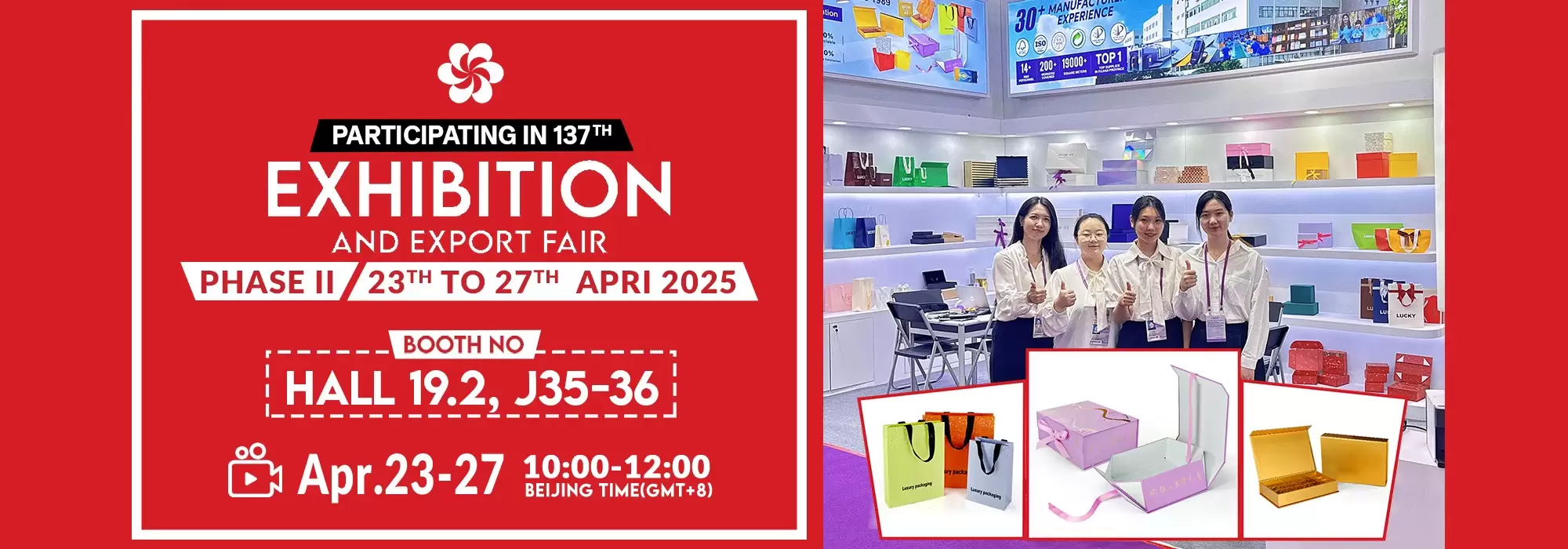 Dal 23 al 27 aprile, vi aspettiamo alla Fiera di Primavera di Canton. Il nostro stand è HALL 19.2, J35-36. Scegliete Xiamen Hengxing Color Printing e riceverete imballaggi in carta di alta qualità, soluzioni di imballaggio ecocompatibili e servizi professionali efficienti. Unitevi a noi per creare brillantezza! Assistiamo insieme all'eccellenza e creiamo brillantezza insieme!